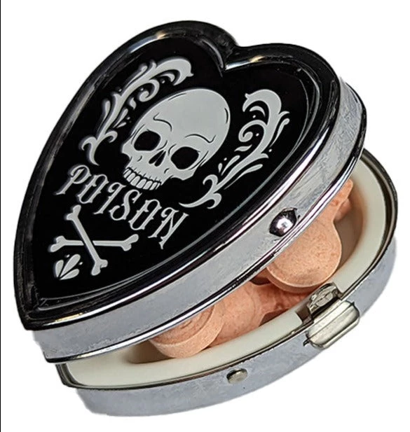 Don’t let the skull and cross bones fool you, any pills in this pill box aren’t actual poison.
