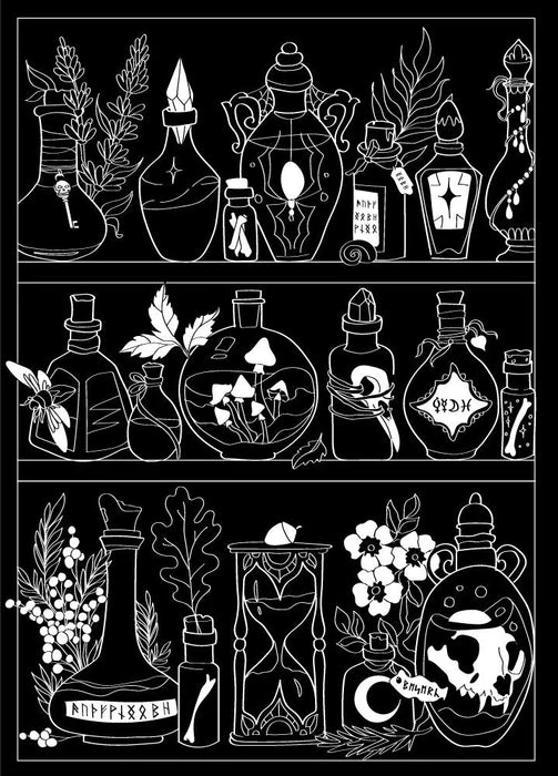 Potions, bones, tinctures and tonics combine to create this incredible Black and White Apothecary design!ย