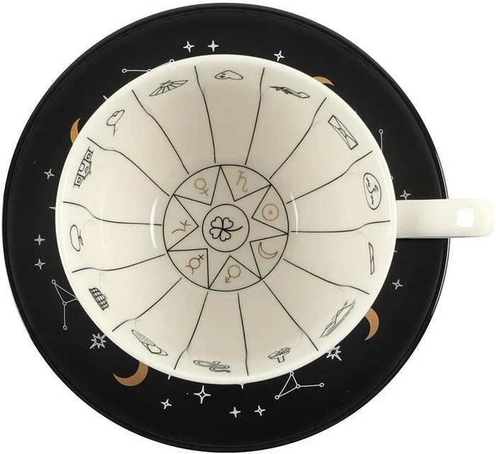 A stunning and unique tea cup to be used for reading tea leaves. Features a variety of fortune telling and astrological symbols accented by gold foil, a contrasting black saucer, and mystical ‘Mysterious things I see when telling fortunes in tea’ text. Truly a piece to be treasured.