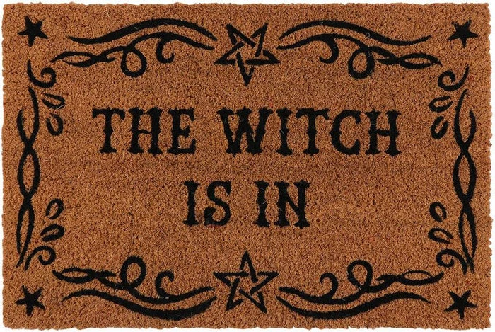 A natural coir doormat with printed ‘The Witch Is In’ text and a flourished border. Makes a fun welcome at the front door of any witch’s home.