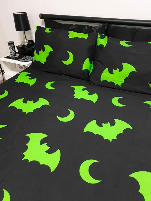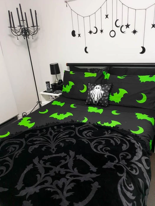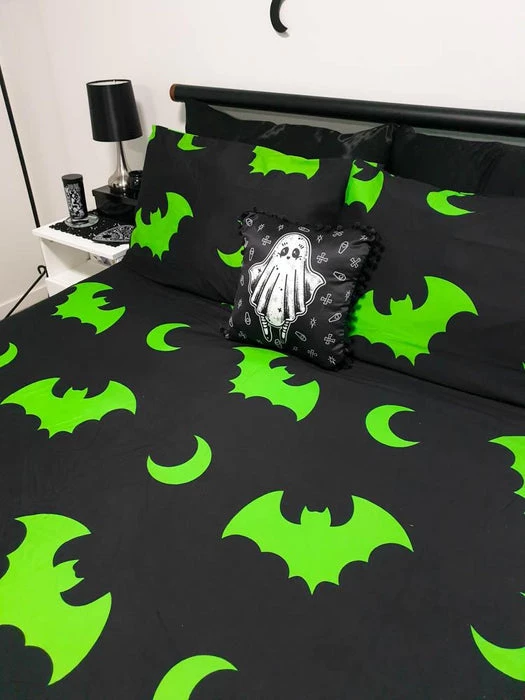 The Creature of the Night Quilt Set brings spooky and macabre vibes to the bedroom. Featuring an all over Bat and Crescent Moon design – perfect for anybody who likes to doze on the deadly side!