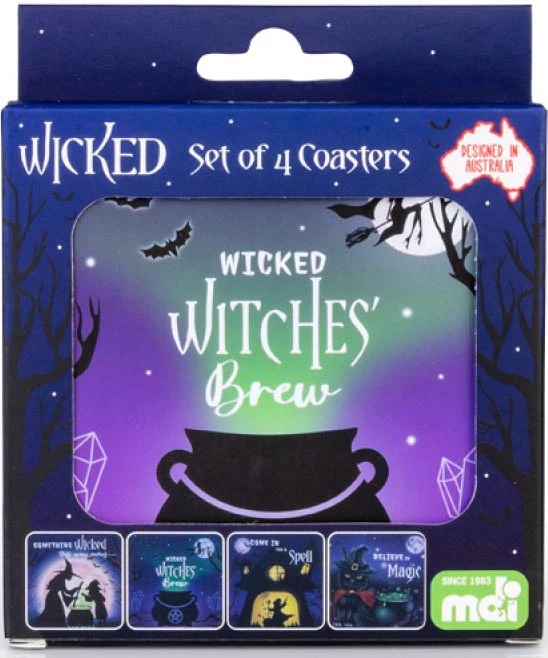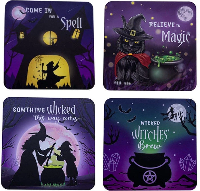 Features magical motifs including bubbling cauldrons, witches and a wise black cat