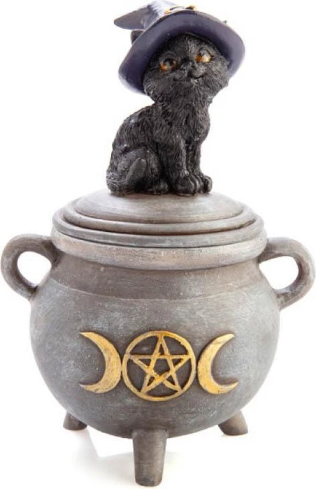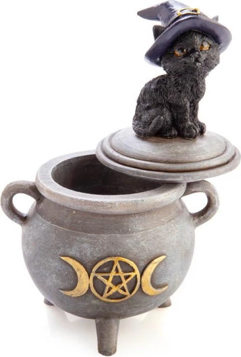 This cute Cauldron Trinket Box will make the perfect addition to your home!Β TheΒ little witchy cat on top and pentacle triple moon add a magical touch!Β