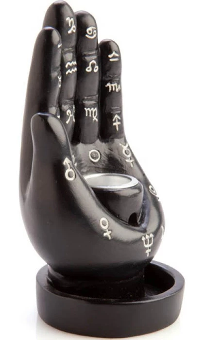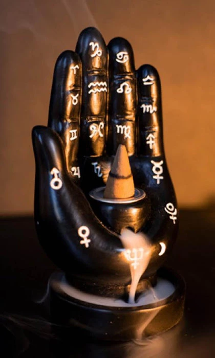 This black backflow incense burner features a stylised Hamsa hand design with astrological symbols on the fingers and palm which add a celestial touch.