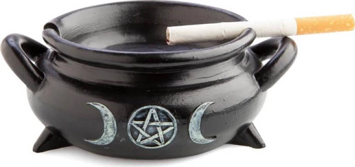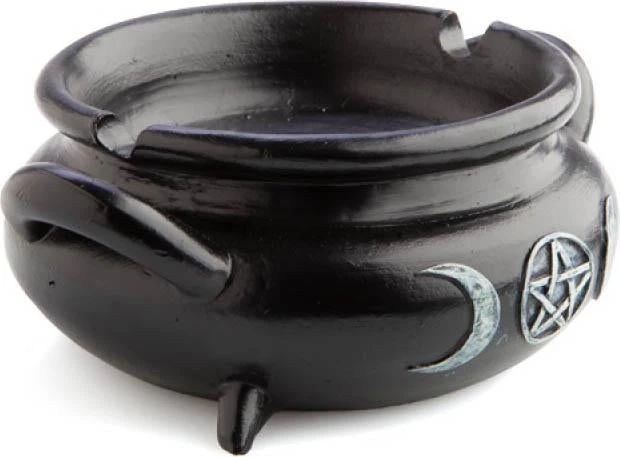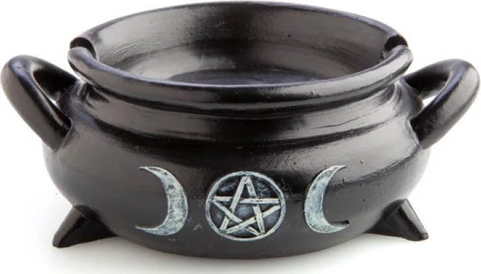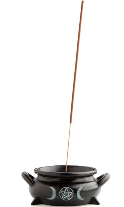 White weathered pentacle & crescent moon symbols embossed on the front of thisΒ black incense burner shaped like a witches’ cauldron!