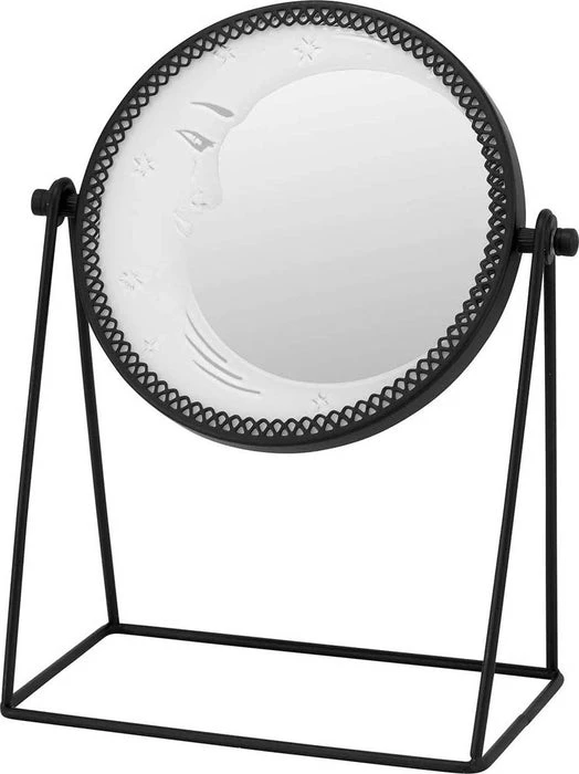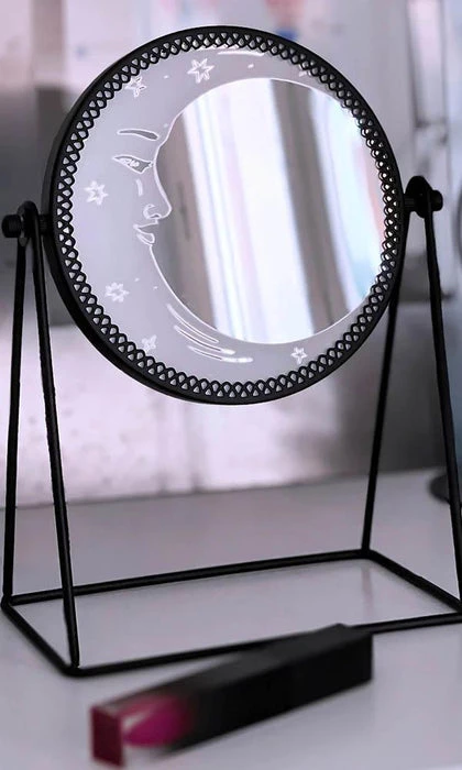 Mirror, mirror on the wall… Add your own dash of moon magic to any room; the enchanted ‘Astral Body’ round desk mirror is perfect for your finishing touches! The perfect size to keep on your desk/vanity table, rounded shape with black iron finish and stand and crescent moon decoration.