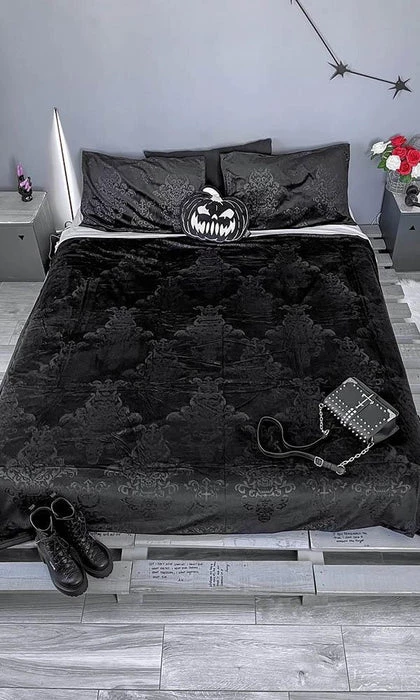 Complete your dream crypt with the luxurious ‘Daemon’ blanket. Made from extra soft fabric and with black-on-black print. Large size – perfect to adorn your [double] bed or getting real-cozy on the sofa.