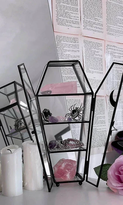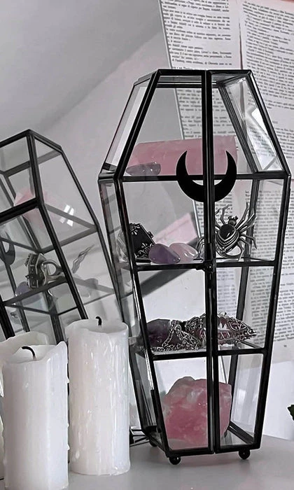 Home sweet haunted home. Add a bit of spooky to your crypt with our ‘Tomb’ display case – complete with double glass lids. Perfect for storing crystals, knick-knacks, keys, secret stuff or whateverz!