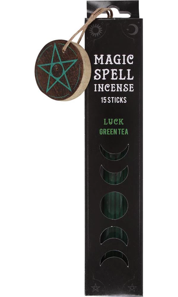 This box of magic spell incense includes 15 green tea scented incense sticks and a matching wooden pentagram holder that is perfect for accompanying spells of good fortune. Whether used for spell work or everyday enjoyment, this fragrance will attract all things lucky.