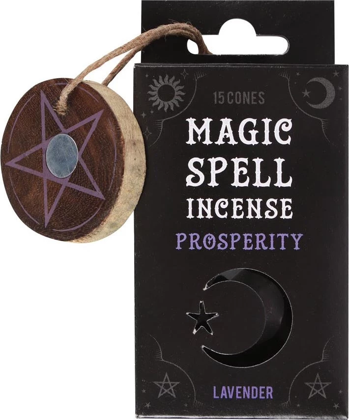 ย This box of magic spell incense includes 15 lavender scented incense cones and a matching wooden pentagram holder that is perfect for accompanying spells of growth and prosperity. Whether used for spell work or everyday enjoyment, this fragrance will attract all kinds of success.