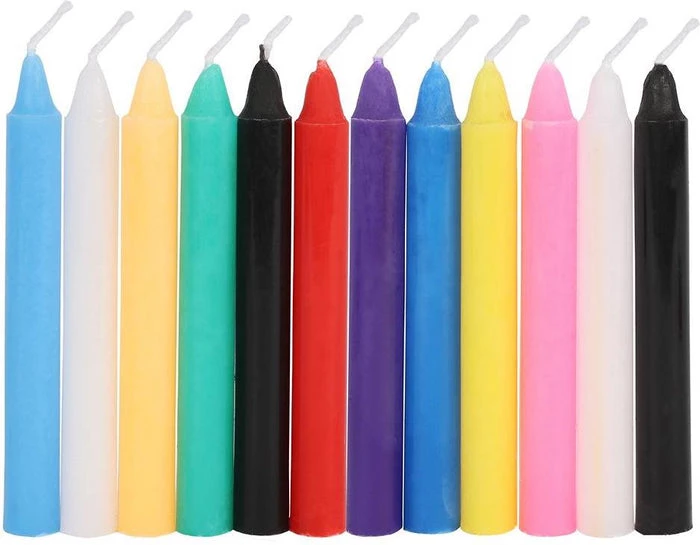 2x black, 2x white, 1x purple, 1x dark blue, 1x light blue, 1x orange, 1x green, 1x red, 1x yellow and 1x pink candle.Β