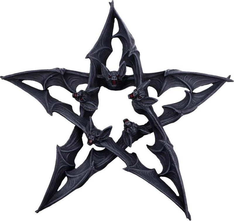 A large colony of Vampire Bats have their wings spread wide as if gliding through the sky. Their piercing eyes are red in colour, adding to their dark charms. Flying in formation each bat comes together to form a deadly pentagram. Cast in the finest resin before being painstakingly hand-painted, this piece would make the perfect addition to any Gothic home.