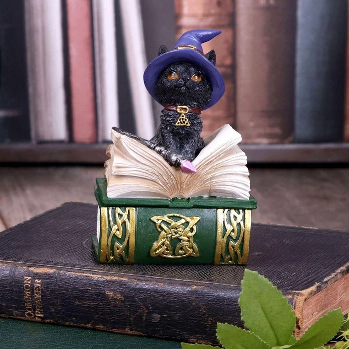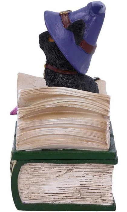 This charming cat figurine is cast in high-quality resin before being painstakingly hand-painted. Binx is feeling playful while sitting inside the pages of an emerald spell book. With a purple Witches hat on his head, he can be lifted to reveal a spacious storage box compartment below, the perfect gift for the charming witch in your life.