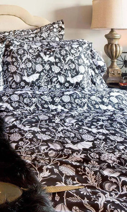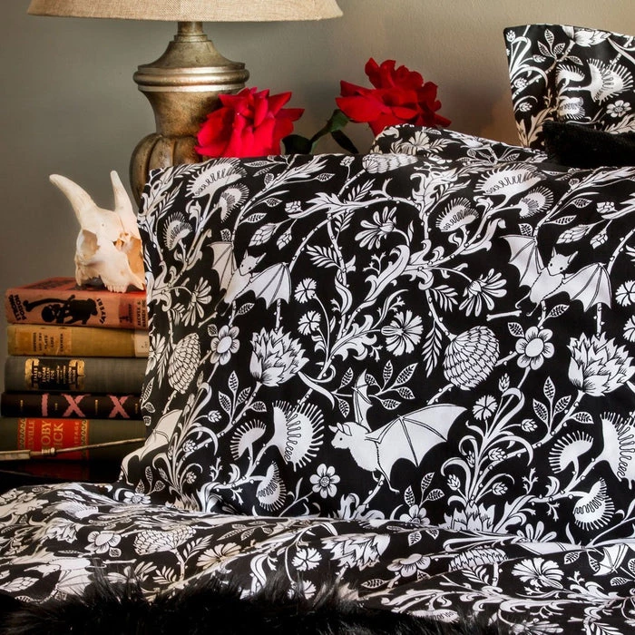 Step into a garden of delight. The Elysian Fields bring bats and botanicals home for you to enjoy. Let the eye wander among non-traditional foliage like Venus Fly Traps and Thistles. Your bat cave deserves the best linens and we’ve got you covered with this bats and botanical print for the home. Features 100% Cotton Sateen (300 Thread Count) and hidden button closure. (Includes 1 Duvet Cover)