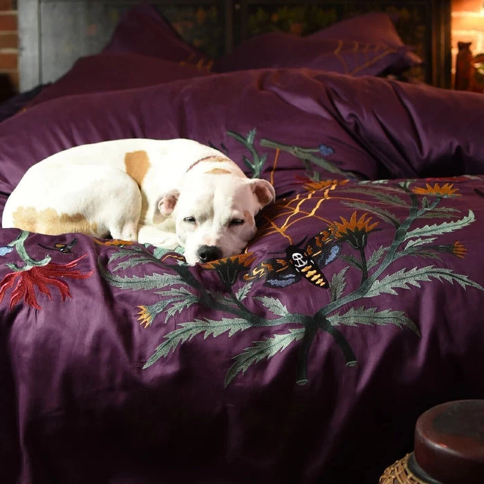 On a deep eggplant-hued base, the Forest Witch Duvet Cover reveals a botanical scene with a golden thread spider web, spider, death moth, bugs and foliage. It takes over 500 stitches to create this scene with luscious gem-tones evocative of the woods from which this inspiration comes. Coordinating Shams have spider webs creeping from the corners, as they do…
