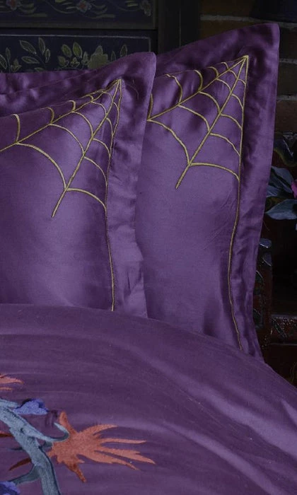 On a deep eggplant base, these Forest Witch Shams have golden spider webs creeping in from the corners, as they do…ย ย
