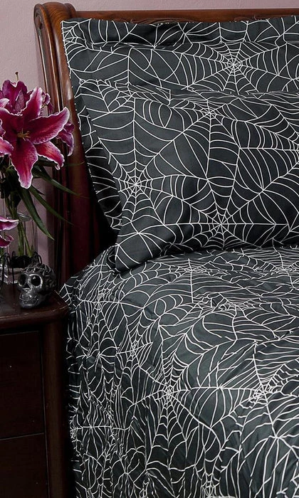 Ensnare your prey with the Spider Web bedding collection. This duvet cover is made of 100% cotton. As soft as spiders silk it features a bone white spider web stretching across jet black fabric.